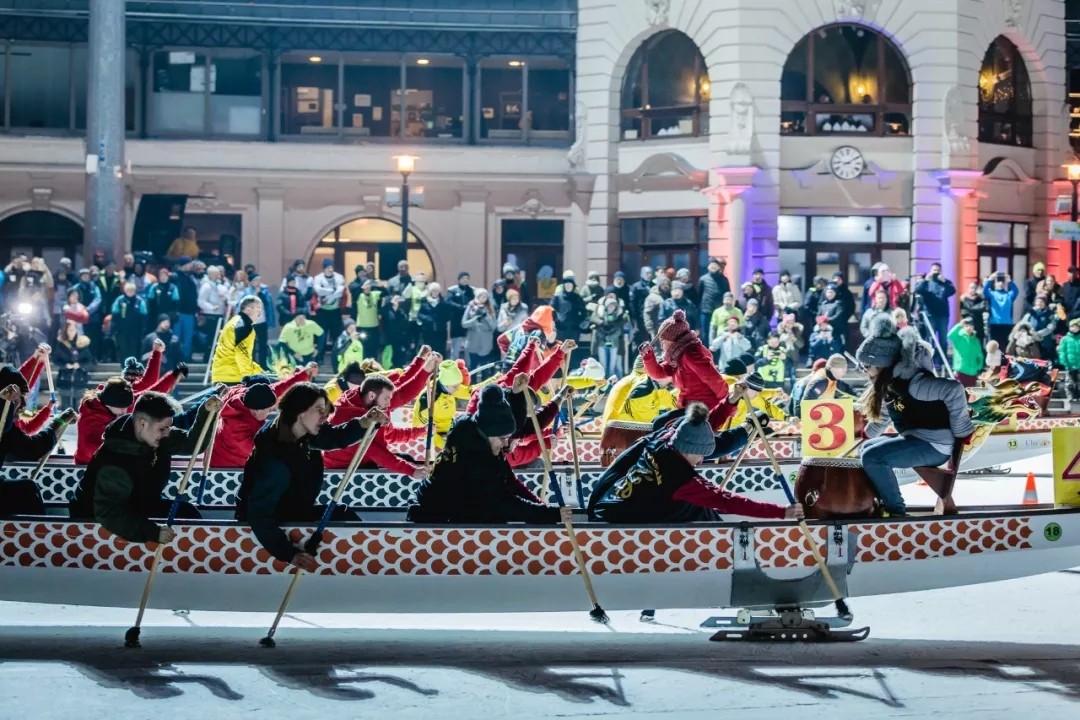 On the competition venue, enthusiasts from all countries voluntarily boarded the dragon boats and launched wonderful contests on the ice. Along with the thrilling